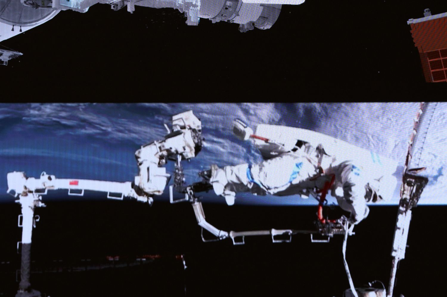 图为北京时间3月16日19时35分,经过7小时的出舱活动,神舟二十一号乘组航天员张陆、武飞、张洪章圆满完成空间碎片防护装置安装等任务。(图/中新社)