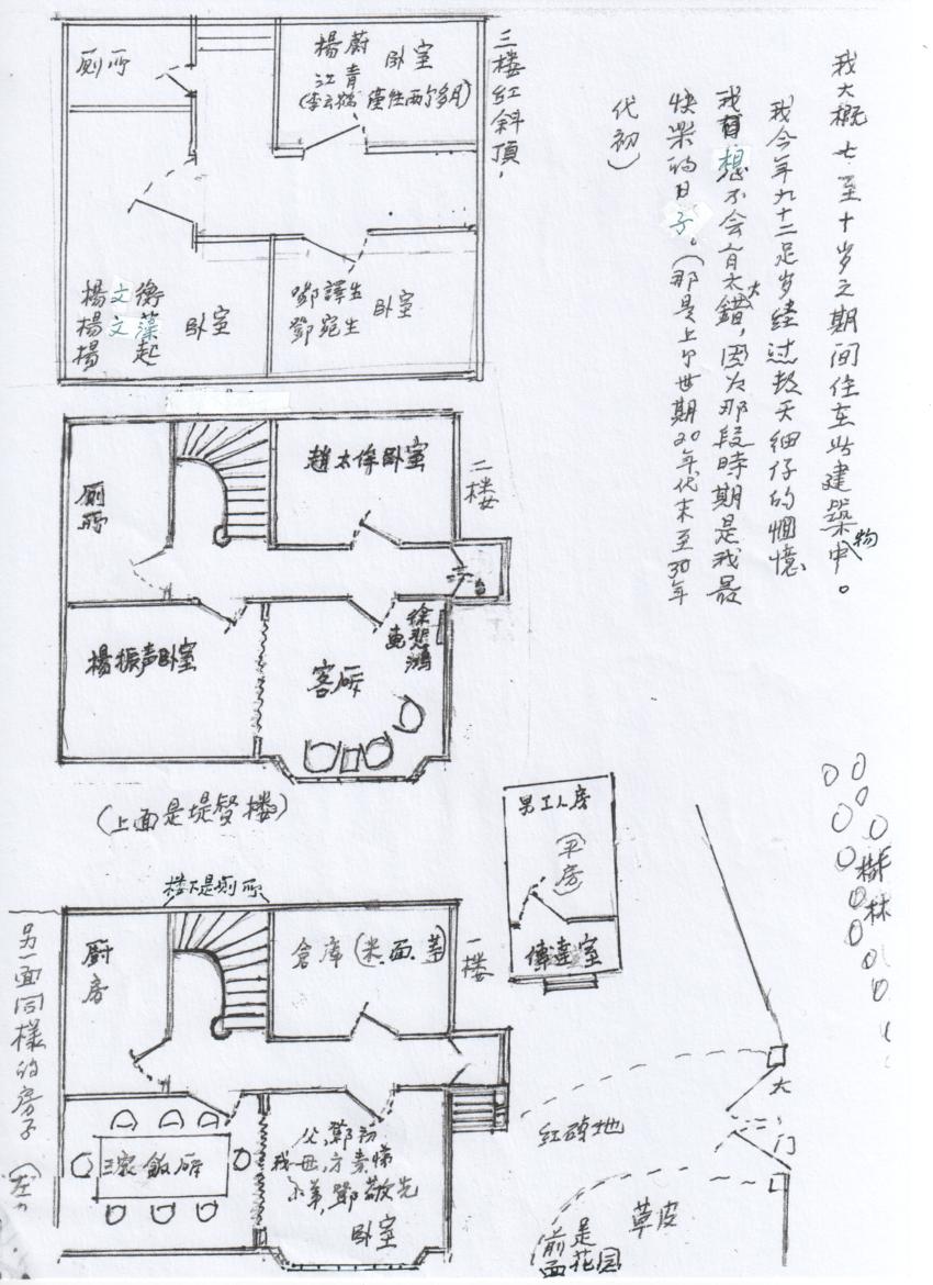 邓宛生在九十二岁时画出的青岛黄县路4号在1931年三家居住状况的内部平面图。