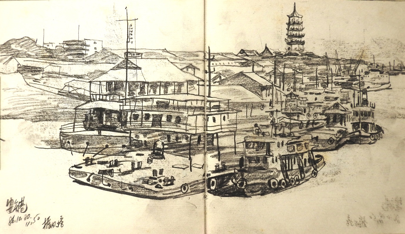 沈嘉蔚安庆港1986碳铅速写纸本画家自藏