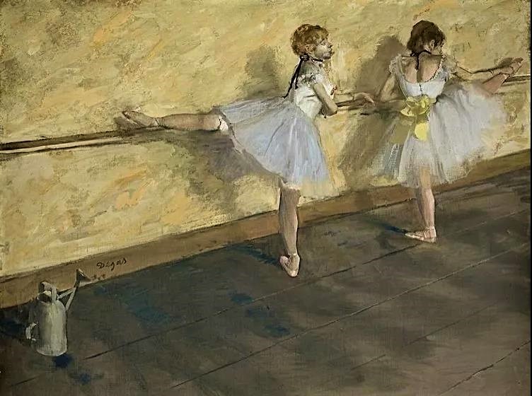 德加的这幅画参加了1877年的印象派画展,画面左角的一个水壶是舞蹈教室的标配,当演员在排练房翩翩起舞时,水壶是用来喷洒水在地板上不让灰尘扬起来,这是德加深入生活和体验生活创造出来的杰作。哈佛梅耶夫人于1929年把德加的这幅《芭蕾舞演员在练功》画作捐赠给了纽约大都会艺术博物馆。