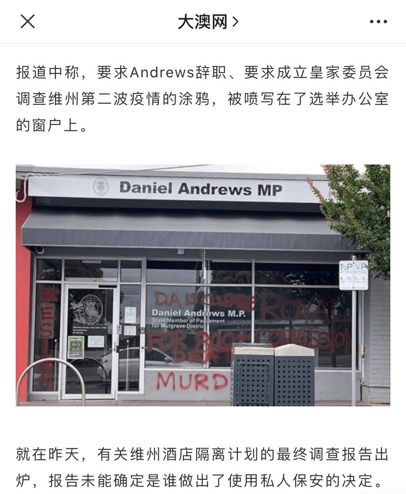 大澳网援引3AW电台报道称,要求Andrews辞职、要求成立皇家委员会调查维州第二波疫情的涂鸦,被喷写在了选举办公室的窗户上。