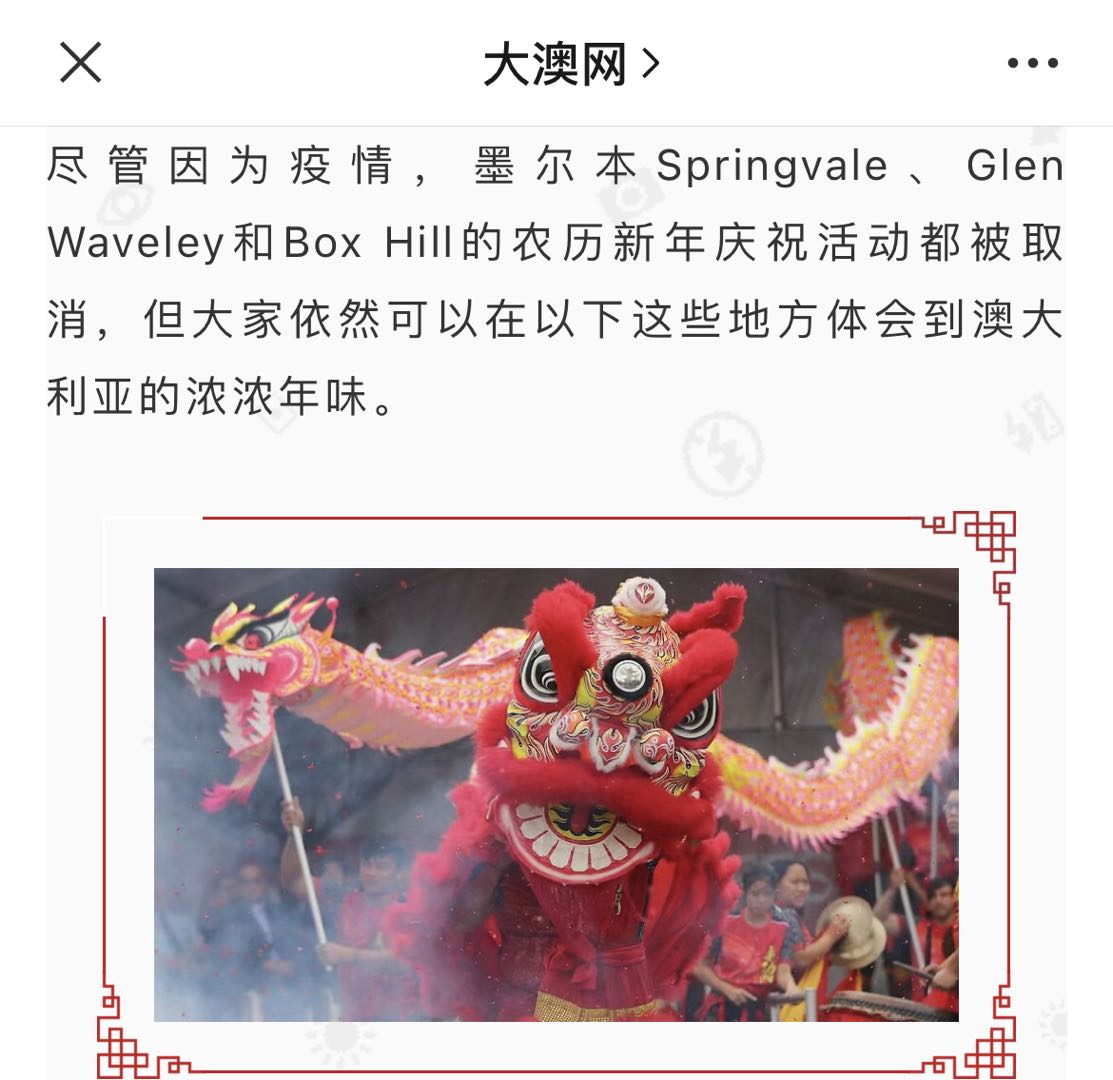 尽管因为疫情,墨尔本Springvale、Glen Waveley和Box Hill的农历新年庆祝活动都被取消,但大家依然可以在以下这些地方体会到澳大利亚的浓浓年味。