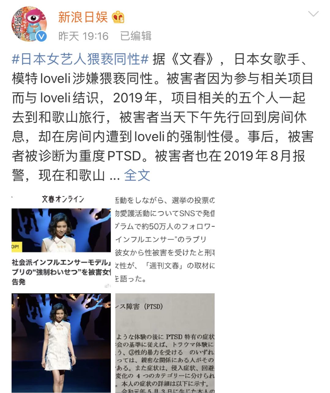 当地时间20日,据媒体报道日本女艺人loveli被曝涉嫌猥亵同性。
