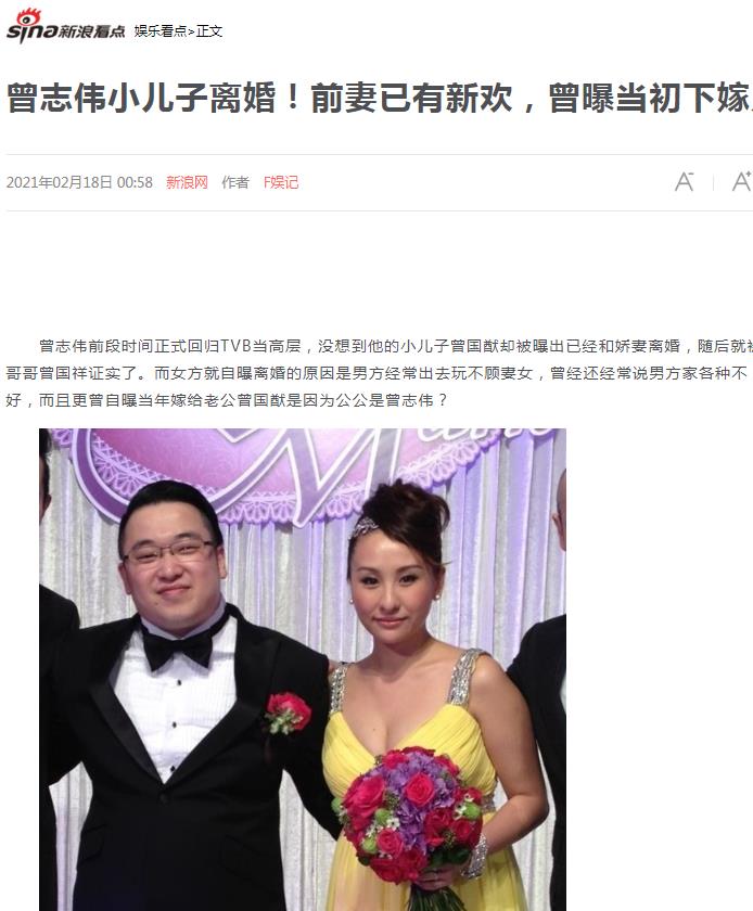 新浪网报道,香港艺人曾志伟前段时间正式回归TVB当高层,没想到他的小儿子曾国猷却被曝出已经和娇妻离婚,随后就被哥哥曾国祥证实了。而女方就自曝离婚的原因是男方经常出去玩不顾妻女,曾经还经常说男方家各种不好,而且更曾自曝当年嫁给老公曾国猷是因为公公是曾志伟?